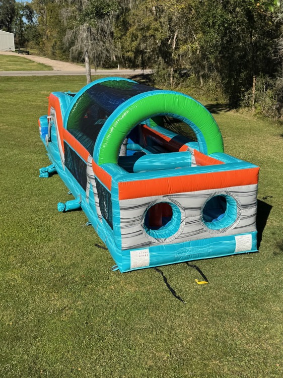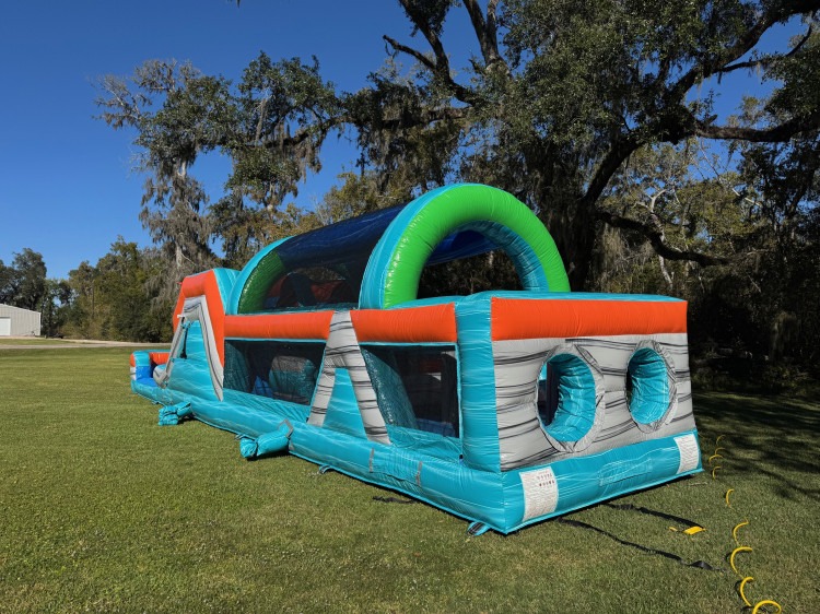 A thrilling, full‑length inflatable obstacle course built for speed, skill, and nonstop fun. At 46 feet long, this course gives racers a substantial run with a variety of challenges—climbable walls, tunnels, slides, and bounce sections—designed to test agility and endurance while keeping safety in mind. Its bright, tropical-inspired look adds eye-catching color to any event and creates an exciting finish-line moment for competitors and spectators alike.