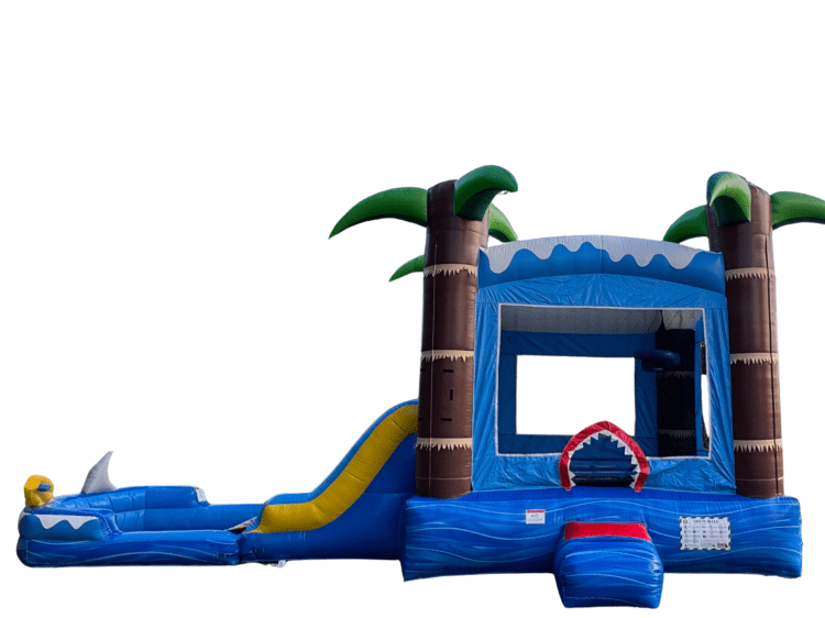 Ocean Shark Bounce House Combo — a shark themed inflatable with a spacious bounce area, safety netting, and an attached slide that turns backyard parties into an undersea adventure. Can be used wet or dry!