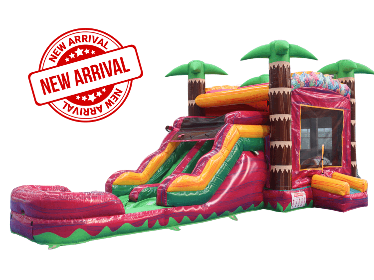 A bright, tropical-themed bounce house with an attached slide that turns any party into a playful island escape. Kids can bounce freely inside the roomy enclosure decorated with pink palms and cheerful accents, then climb up and whoosh down the built-in slide for extra thrills. Mesh side panels keep the space well-ventilated and visible to supervising adults, and the low-entry step and soft landing area help make play safer for younger guests. Ideal for birthdays, family gatherings, or backyard celebrations where fun, color, and active entertainment are on the agenda.